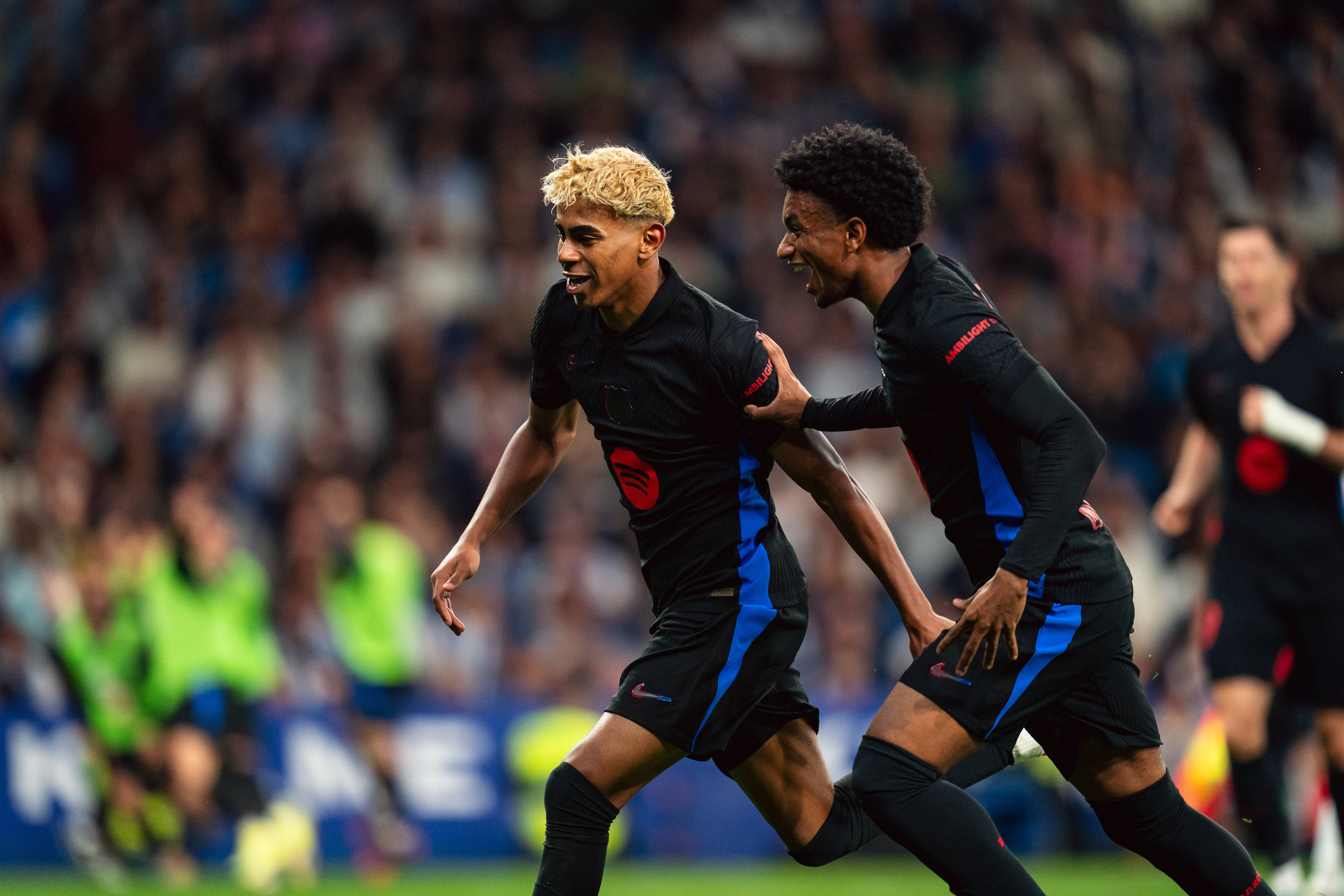 5月15日,巴塞罗那队球员亚马尔(左)和巴尔德在比赛中庆祝进球。新华社发(胡安·戈萨摄)本场见效后,巴萨以27胜4平5负积85分领跑,逾越第二名皇马7分之多。由于联赛仅剩两轮,巴萨得以提前摘取冠军。